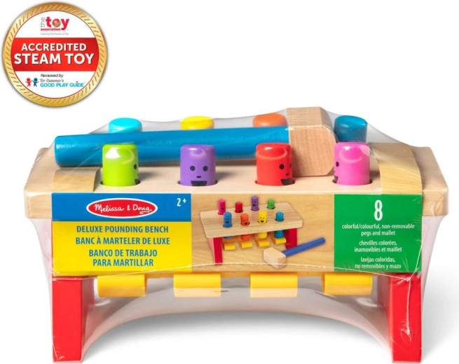 Ta lesena zabijalna klop ponuja brezčasno igro: otroci z kladivcem nežno zabijajo pisane zatiče v klop in jih na drugi strani spet iztisnejo. Robusten lesen okvir in gladki robovi zagotavljajo varno igro, izrazite barve pa podpirajo razvoj vidnega zaznavanja.