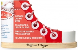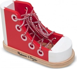 Lesen čevelj z vezalkami MELISSA & DOUG pomaga otrokom od 3. leta osvojiti pomembno veščino – samostojno zavezovanje čevljev. Zahvaljujoč stabilni leseni konstrukciji, več ušescem in tekstilni vezalki lahko otroci vadijo različne načine prepenjanja in vozlov, od preprostega prepenjanja do mašeljca.