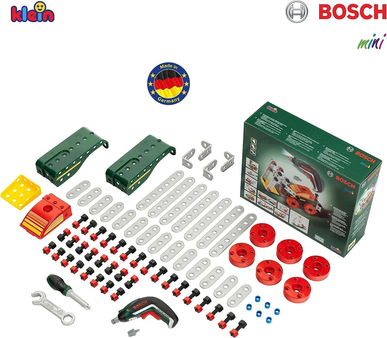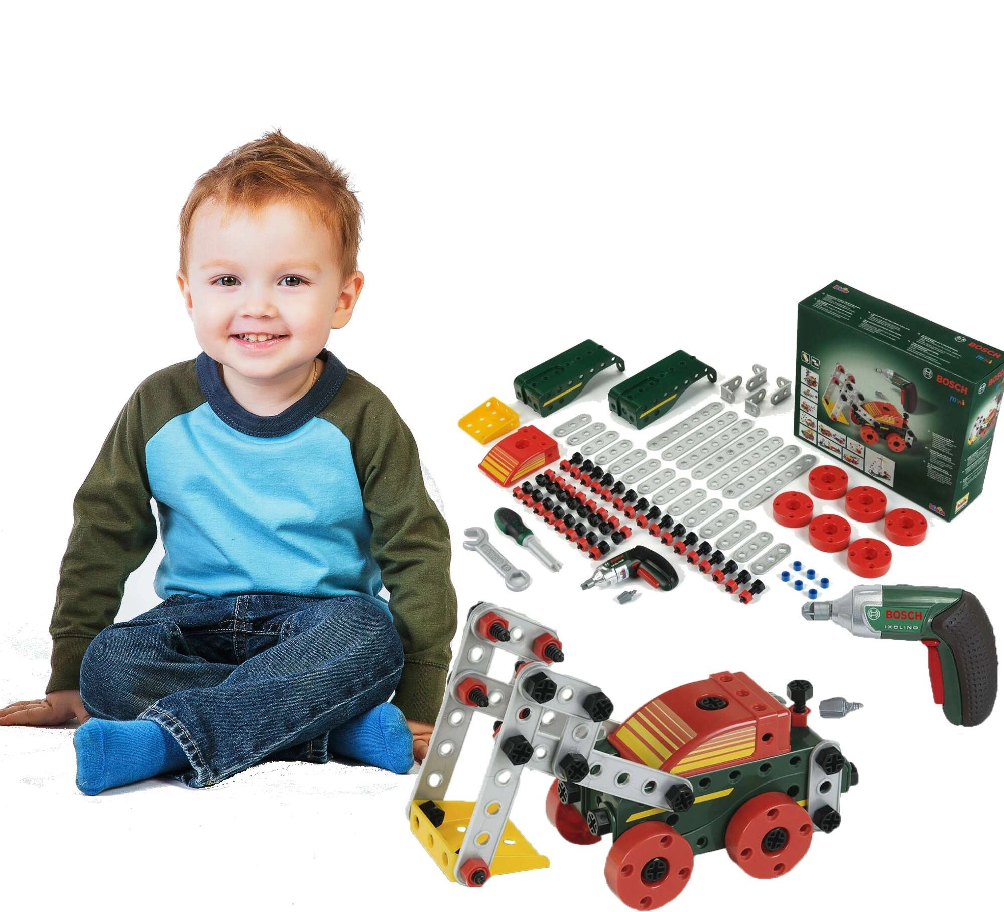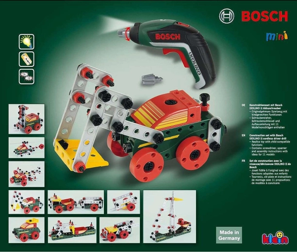 Ta bogato opremljen gradbeni komplet združuje ustvarjalno sestavljanje z realistično igro z pravim orodjem. Otroci lahko s pomočjo otroškega akumulatorskega izvijača BOSCH Ixolino privijajo vijake, povezujejo dele in gradijo lastne konstrukcije ali pa sledijo priloženim navodilom za 11 modelov vozil.