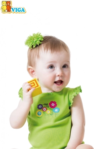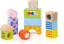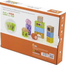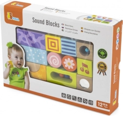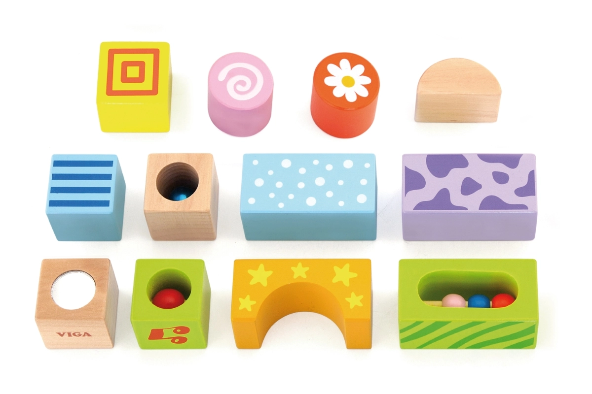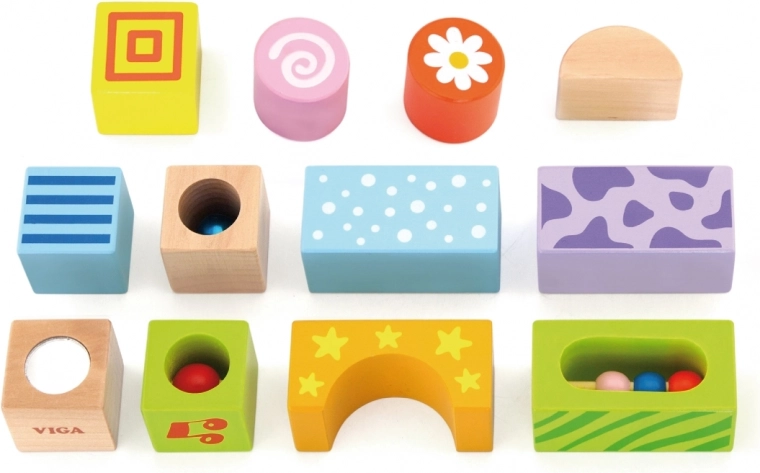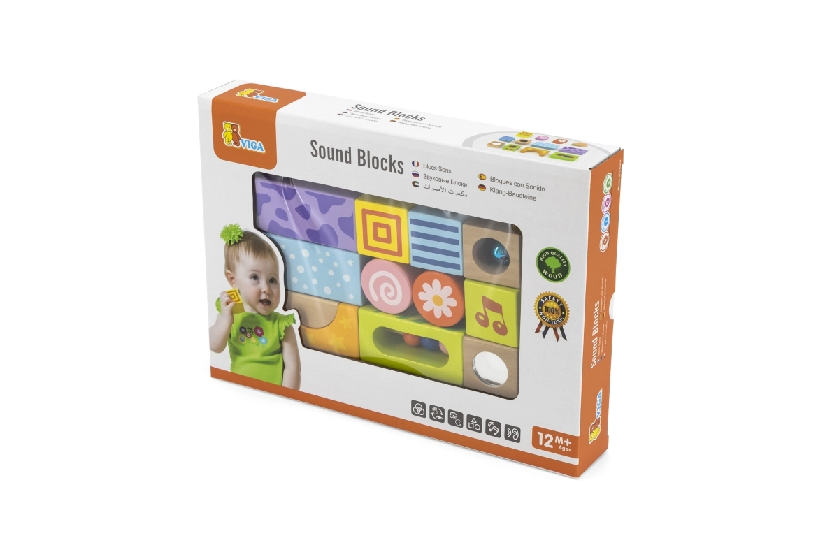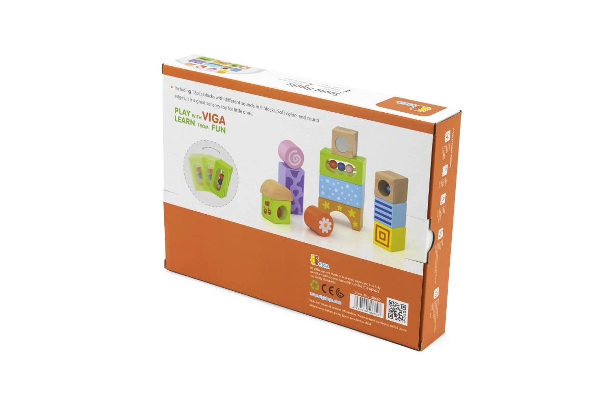 Ta set lesenih zvočnih kock prinaša otrokom prvo veselje do gradnje in odkrivanja zvokov. Vsaka kocka je zasnovana tako, da pritegne z barvami, vzorci in različnimi zvočnimi elementi (zvonček, ropotanje), ki razvijajo sluh in koordinacijo oko–roka.