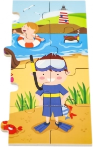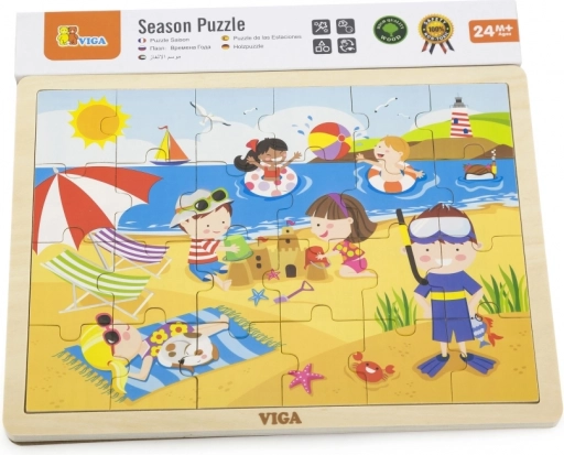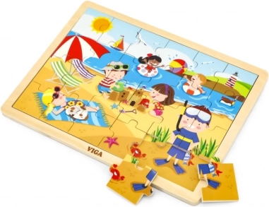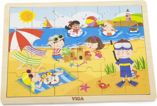 VIGA lesene puzzle poletje – 24 kosov so idealna prva sestavljanka za otroke od 2 let naprej. Čvrsti leseni koščki in okvir pomagajo ohranjati motiv na mestu, zato se lahko otroci osredotočijo na sestavljanje in veselje ob rezultatu. Vesela poletna ilustracija s plaže naravno razvija besedni zaklad in domišljijo.