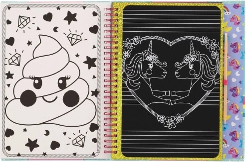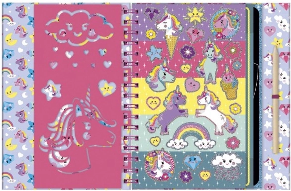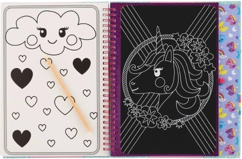 Knjiga za praskanje s samorogovimi motivi ponuja zabavo in hkrati razvija ustvarjalne sposobnosti. Zahvaljujoč trdim platnicam in spiralni vezavi je enostavno obračanje strani in idealna za potovanja: