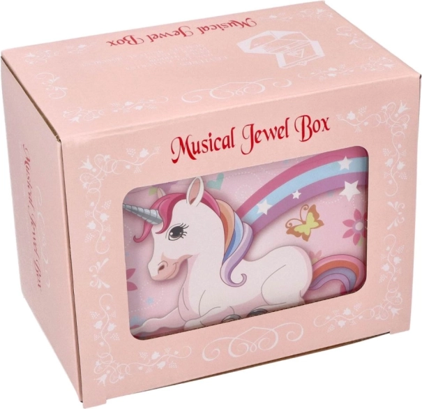 Škatlica za nakit v slogu glasbene skrinjice bo razveselila vsako malo damo. V notranjosti najdete ogledalce in ljubko figurico samoroga, ki se po odprtju pokrova začne vrteti ob melodiji Labodje jezero. Notranjost je podložena z mehko tkanino, da so verižice, zapestnice in prstančki varno shranjeni.