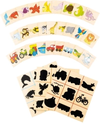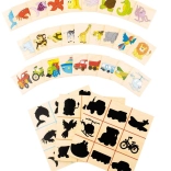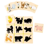 Barvite lesene ploščice z ilustracijami živali in vozil otroci ujemajo z ustreznimi sencami. Zabavna oblika, ki spodbuja razlikovanje oblik in uri pozornost.