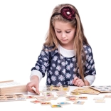 Lesene puzzle Najdi senco so idealna izobraževalna igrača za otroke od 2 let. Barvito ilustrirane ploščice z motivi živali in vozil se ujemajo z njihovimi siluetami, kar podpira vizualno zaznavanje, logično razmišljanje in fino motoriko. Lakirana površina in gladki robovi zagotavljajo varno in prijetno igro.
