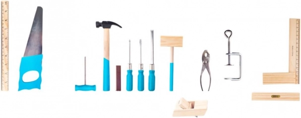 Vključena so osnovna orodja, kot so žagica, kladivo, izvijači, ključ in ravnilo v kombinaciji lesa in kovine z udobnimi modrimi ročaji. Komplet je zasnovan za varno in smiselno igro ter podpira samostojnost in domišljijo.