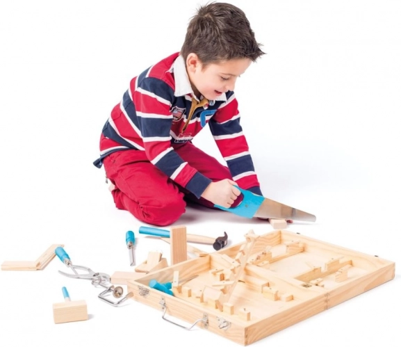 Ta leseni komplet orodja v kovčku otrokom ponuja realistično izkušnjo »popravil« in ustvarjanja – varno in zabavno. Zaradi trpežnega kovčka s kovinskimi zaponkami imajo vsi deli svoje mesto in so vedno pripravljeni na igro doma in na poti. Pri igri otroci urijo spretnost, koordinacijo oko–roka in logično mišljenje.