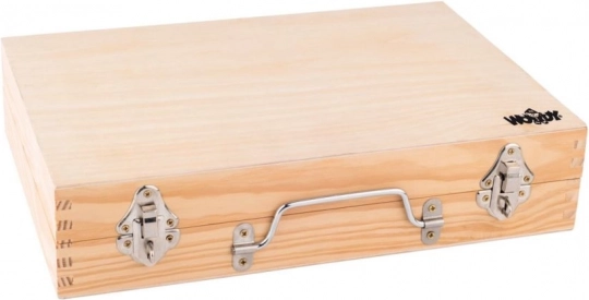 Robusten lesen kovček s kovinskim zapiranjem in ročajem ščiti orodje ter omogoča enostavno prenašanje kamor koli – v sobo, na vikend ali k starim staršem.