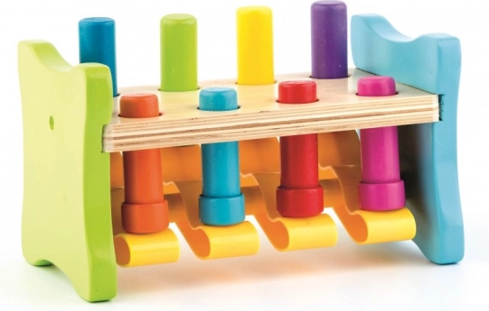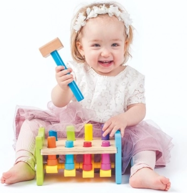 Ta sodobna različica klasičnega lesenega tolkala znamke WOODY prinaša otrokom veselje do odkrivanja in učenja. Zatiči so povezani s plastično zibelko, zato ima vsak udarec s kladivcem takojšen in viden učinek – en zatič se potisne navzdol, drugi poskoči navzgor. Otroci si tako na igriv način urijo moč prijema, natančnost in potrpežljivost.