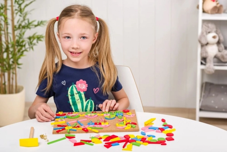 Otroci lahko pribijajo posamezne oblike in ustvarjajo like, prevozna sredstva ter celotne zgodbe. Gradnja spodbuja domišljijo in logično razmišljanje.