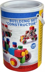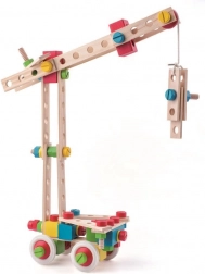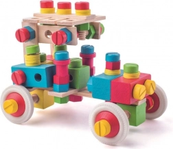 Ta raznolik komplet s 140 deli omogoča otrokom gradnjo vozilc, oblik in preprostih konstrukcij. Barvni vijaki, spojke in kolesa spodbujajo raziskovanje, medtem ko leseni elementi igri dodajo prijeten naraven značaj. Vse je shranjeno v trpežnem vedru, ki pomaga ohranjati red v otroški sobi.
