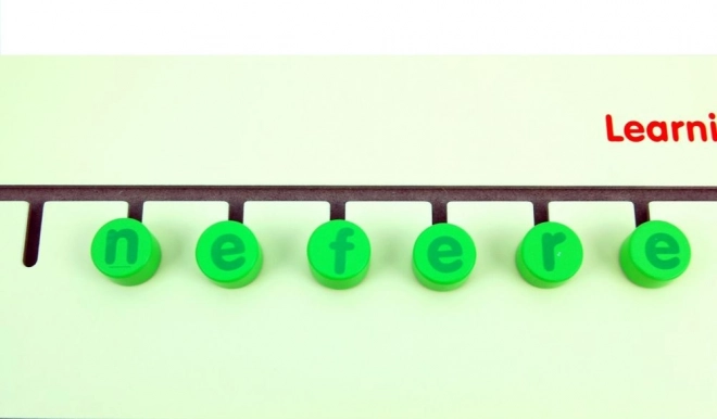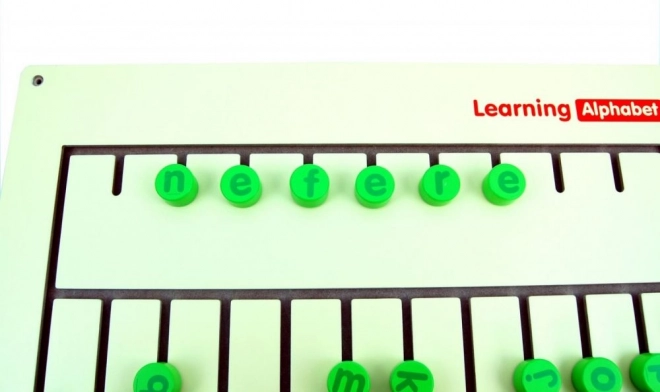 Zeleni žetoni s črkami se vstavljajo in premikajo po utorih, zato otroci na igriv način vadijo prepoznavanje črk in sestavljanje preprostih besed, kot je »apple«.