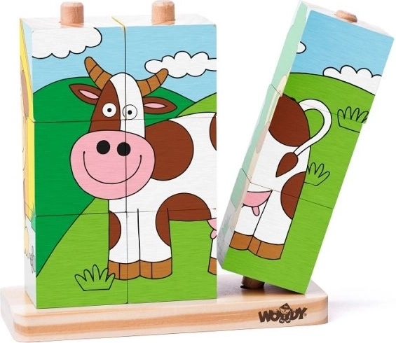 Sestavljanka vsebuje prisrčne ilustracije živali, kot so krava, pes, ovca in mačka, ki vzbujajo otroško radovednost in pomagajo pri prepoznavanju.