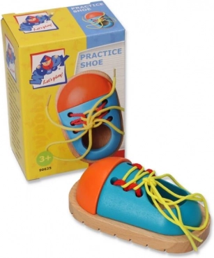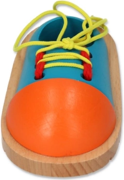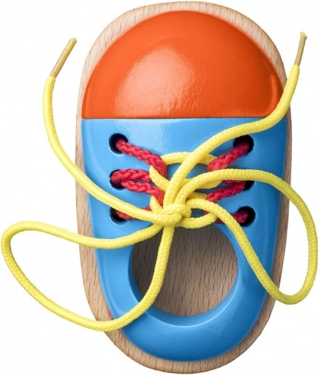 Ta barviti leseni čeveljček je pametno zasnovan pripomoček, s katerim si otroci na igriv način vadijo zavezovanje vezalk. Čvrsta konstrukcija z gladkimi robovi je varna za male roke, jasne barve pa vabijo k ponovnemu treningu.