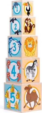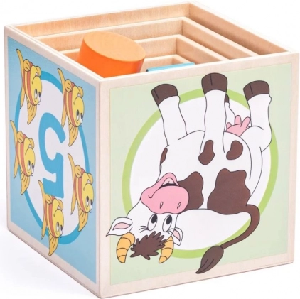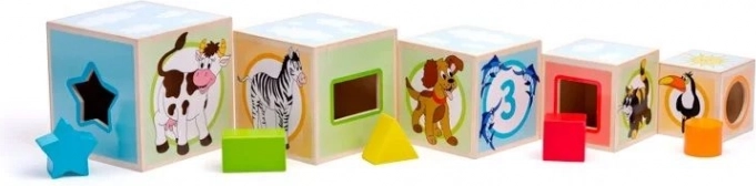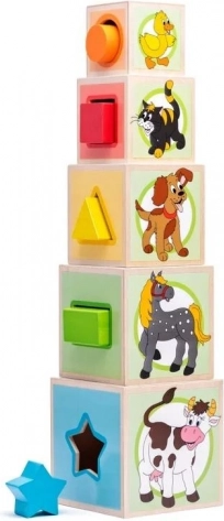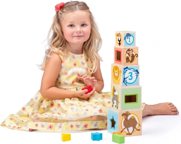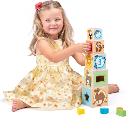 Leseni stolp z lončki in sortirnikom oblik združuje zlaganje v višino z vadbo vstavljanja pravih oblik v ustrezne odprtine. Otroci razvijajo koordinacijo oko–roka, spoznavajo barve, številke in živalice ter se hkrati zabavajo v ustvarjalni igri.