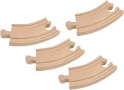 Ta komplet 4 kratkih ukrivljenih tirov je odličen dodatek vsaki leseni vlakovni progi. Zahvaljujoč dolžini 10 cm na kos zlahka ustvarite kompaktne loke, povezave in nove oblike trase. Tiri se intuitivno spajajo in so primerni za male graditelje od 3 let.
