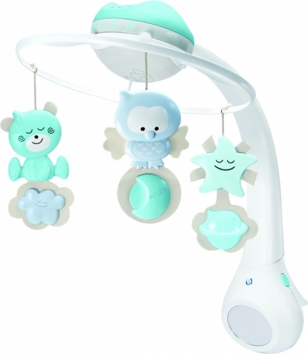 Ta vsestranski vrtiljak raste z vašim otrokom: od novorojenčkovega obdobja kot vrtiljak z nežno svetlobo in glasbo (0–5 mesecev), prek nočne lučke z glasbo na posteljici (6–18 mesecev), do samostojne nočne lučke z glasbo na nočni omarici (18+ mesecev). Projektor projicira zvezdice in ustvarja mirno vzdušje za lažje uspavanje.