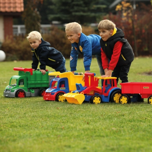 Gigantski traktor z nakladačem in prikolico prinaša obilo realistične zabave pri gradnji, nakladanju in prevozu tovora. Robustna konstrukcija, dolga 117 cm, zdrži intenzivno otroško igro, medtem ko funkcionalna žlica in prikolica z odpirajočo se zadnjo loputo vsako akcijo v peskovniku spremenita v pravo doživetje.