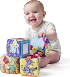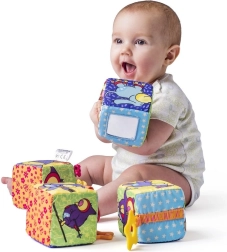 Odkrijte čar prvih iger s tekstilnimi kockami NINY. Vsaka kocka je skrbno zasnovana za najmlajše, prijetna na dotik in polna dražljajev, ki razvijajo sluh, vid in tip. Zaradi mehkega materiala so idealne za majhne rokice ter varne za igro na tleh in v posteljici.