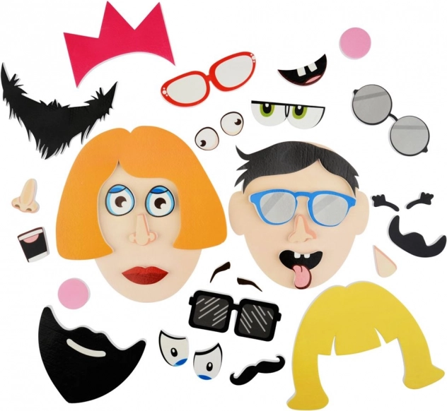 - 35 koščkov – oči, nosovi, usta, lasje, očala, krona in drugi dodatki