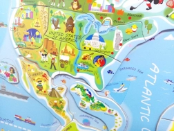 Zemljevid vsebuje imena oceanov, držav in mest v angleščini. Kosi so narejeni iz trpežne lesene vezane plošče z vgrajenimi magneti. Izdelek je zasnovan tako, da ga je mogoče enostavno obesiti na steno.