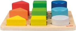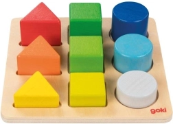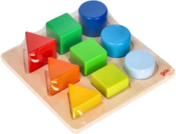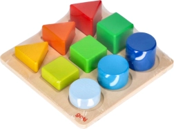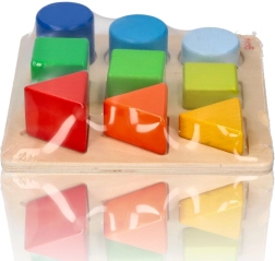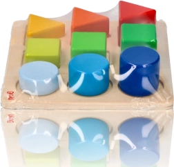 Igrača je izdelana iz masivnega naravnega lesa in vključuje osnovno ploščo ter 9 barvnih oblik. Pomaga otrokom učiti oblike, barve, razvijati njihovo kreativnost in fino motoriko. Vsaka oblika je izrazito barvna, kar spodbuja vizualno dojemanje in je hkrati idealna za igrivo in zabavno učenje.