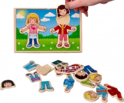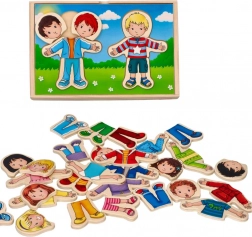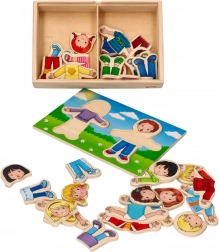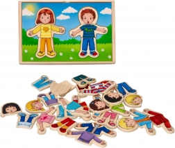 Ta priljubljena oblačilna sestavljanka je izdelana iz kakovostnega lesa, ki je ne le vzdržljiv, ampak tudi ekološki. Dobavljena je v praktični leseni škatli s pokrovom, ki hkrati služi kot podlaga za sestavljanje. Otroci si lahko z menjavo glav, teles in nog ustvarijo nešteto kreacij in pri tem uživajo v veliko zabavi.