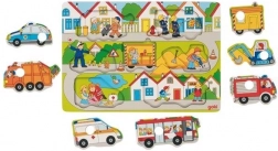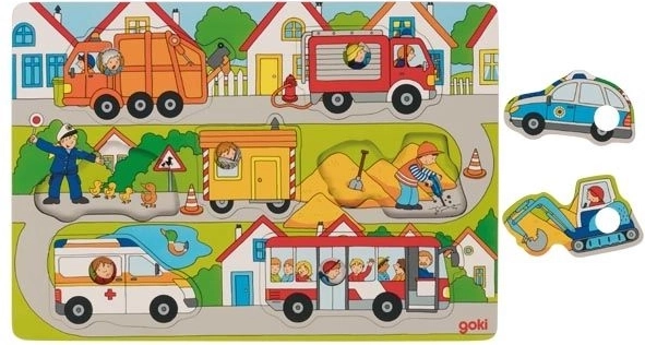 Pomoč pri razvoju koordinacije oči-roka, logičnega razmišljanja in domišljije. Zaradi slikovitega lesenega podstavka je zlaganje enostavno, okvirji pa zagotavljajo, da lesena vozila ostanejo na svojem mestu.