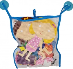 Komplet vključuje praktično vrečko iz mrežastega materiala, ki omogoča enostavno sušenje in shranjevanje igrač po uporabi.