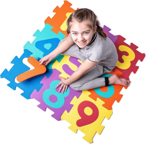 Barvita penasta sestavljanka z izrezljivimi številkami je zabaven način, kako otroke seznaniti s številkami od 0 do 9. Enostavno jo je sestaviti v obliko konstrukcijske sestavljanke ali uporabiti kot mehko talno podlogo. Je netoksična, izperljiva in varna za igro. Spodbuja fino motoriko, domišljijo in prve matematične veščine. Zaradi večjih kosov je idealna za majhne otroške ročice.