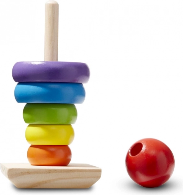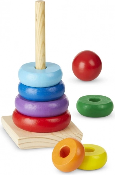 Konstrukcija je izdelana iz visokokakovostnega lesa, kar zagotavlja trpežnost in dolgo življenjsko dobo igrače. Otroci bodo vzljubili žive barve in preprost koncept zlaganja prstanov na palico.