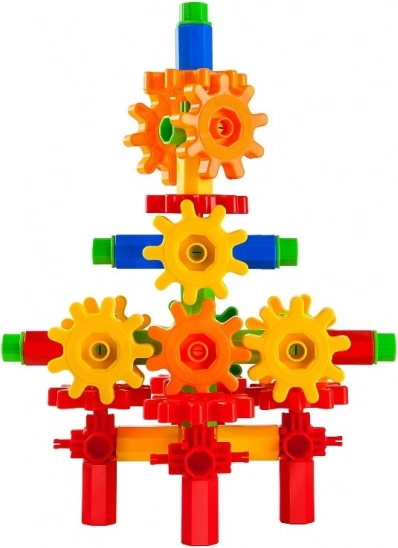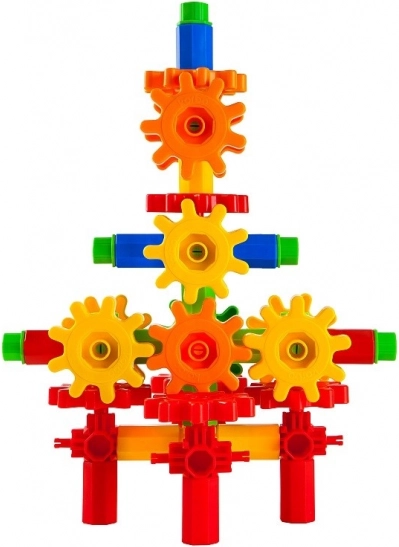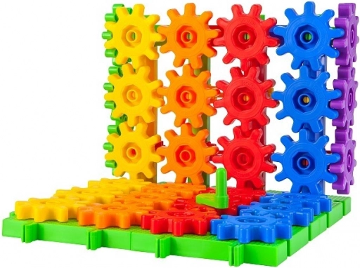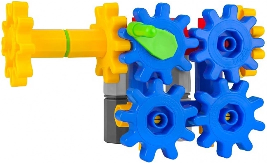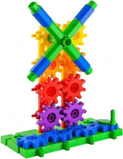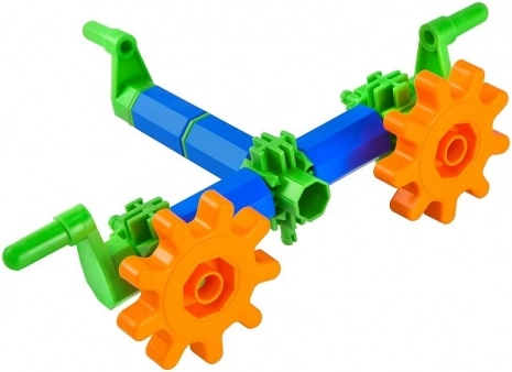 Komplet vsebuje posebna pogonska kolesa (prestave), ki omogočajo vrtenje in premikanje konstrukcij, kar razvija mehanske spretnosti.