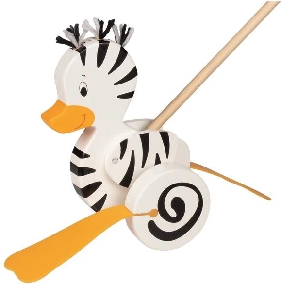 Prisrčna lesena račkica na palici znamke Goki bo razveselila vsakega malčka. Med potiskanjem se vesela račkica zibaje premika in motivira otroke k hoji. Igrača podpira razvoj grobe motorike, koordinacijo in prinaša veliko aktivne zabave že od 1. leta dalje.