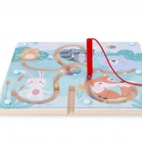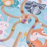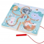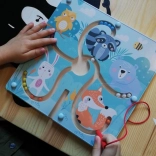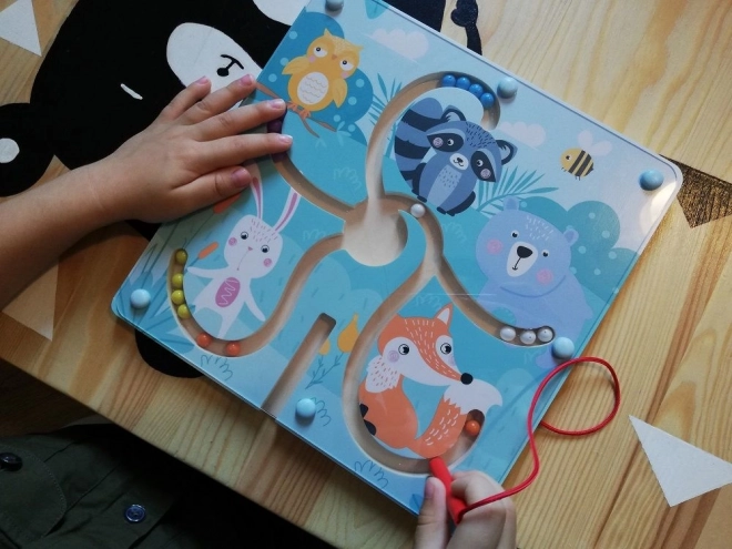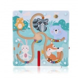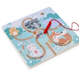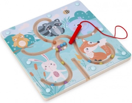 Leseni magnetni labirint z motivom gozdnih živalic navduši male raziskovalce že od 2. leta dalje. S pomočjo magnetne paličice bodo otroci premikali barvne kroglice po stezicah, urili fino motoriko, koordinacijo oko–roka in logično razmišljanje. Kroglice ščiti prozoren pokrov, paličica je pritrjena na vrvico, kompaktne dimenzije 22,5 × 22,5 cm pa ga naredijo idealno potovalno igračo. Certifikat CE.