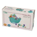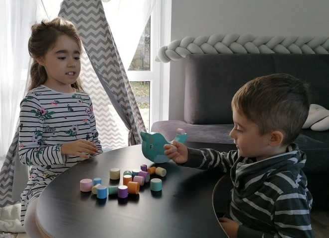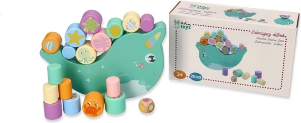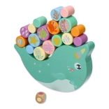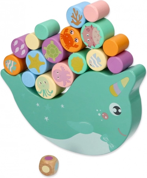 Odkrijte zabavno leseno ravnotežno igro z narvalom, v kateri otroci uravnotežajo pisané valjčke z motivi morskih živalic na gugalni osnovi. Cilj je ohraniti ravnotežje in zlagati delčke tako, da se narval ne prevrne – odlična vadbena igra za fino motoriko, koordinacijo oči in rok ter potrpežljivost.