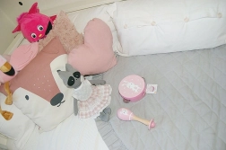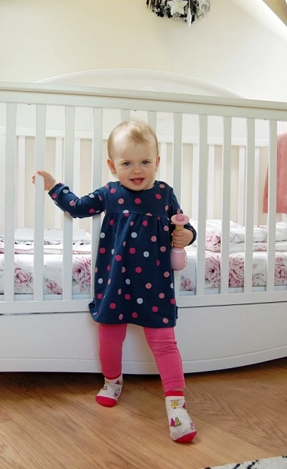 Vesel rožnat dizajn z zajčkom pritegne otroke na prvi pogled in podpira njihov vizualni razvoj.