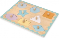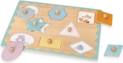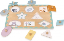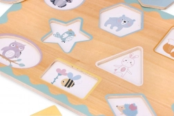 Odkrijte trpežno leseno vstavljanko s čepki, kjer ima vsak košček svoje natančno mesto. Pregledne oblike, nežne pastelne barve in ljubki motivi živalic vabijo k igri, medtem ko praktični čepki olajšajo prijem tudi najmlajšim.