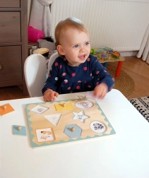 Ta smiselna igrača spodbuja koncentracijo, logično razmišljanje in koordinacijo gibov. Otroci naravno vadijo poimenovanje oblik in barv, urijo pravilen prijem ter pridobivajo samozavest pri ravnanju z manjšimi predmeti.