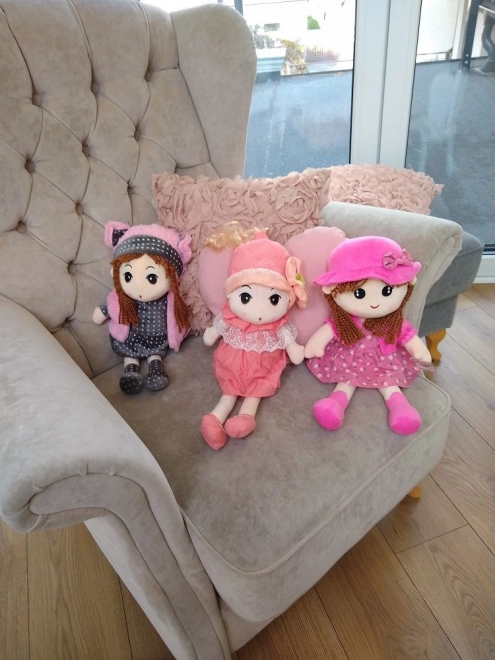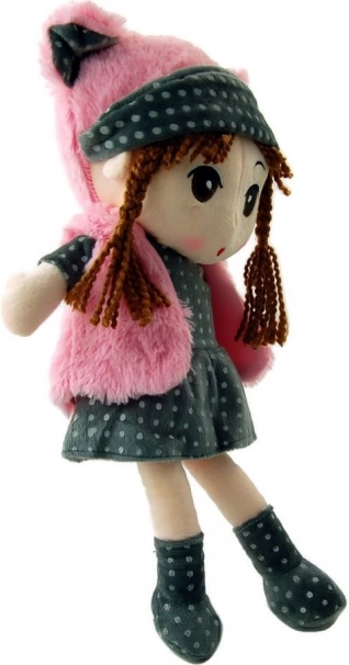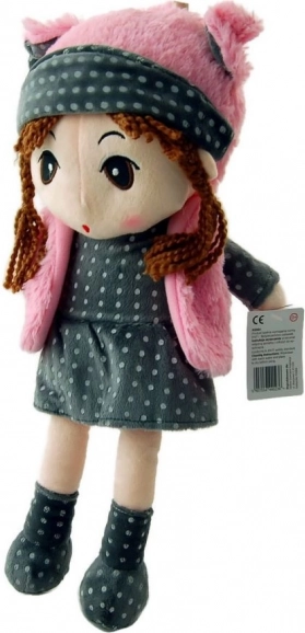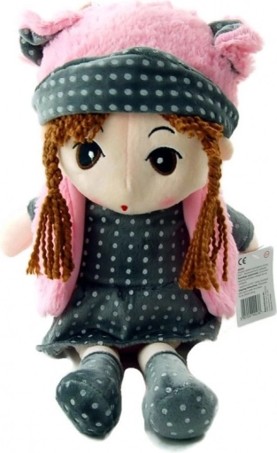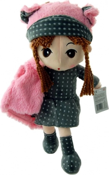 Spoznajte punčko Pola, čudovito plišasto igračo z rjavimi pletenimi lasmi, ki se ponaša s sivim pikčastim oblačilom in rožnatimi dodatki. Ta mehka igračka je idealen spremljevalec za vsakodnevne igre in tudi za mirne noči.