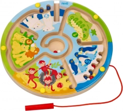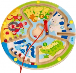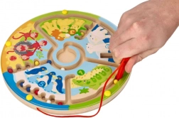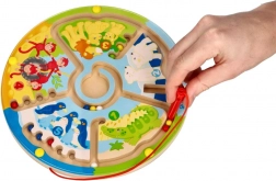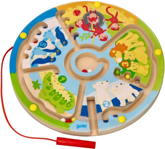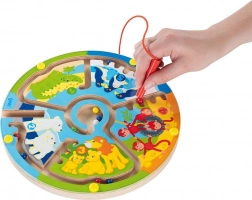 Odkrijte čar učenja skozi igro. Otroci z magnetnim svinčnikom vodijo barvite kroglice po vijugastih poteh labirinta na dva načina: klasično premikanje kroglic do cilja ali razvrščanje po barvah in številkah. Živali iz živalskega vrta in števila 1–5 pritegnejo male igralce ter jih naravno motivirajo k štetju in osredotočenosti.