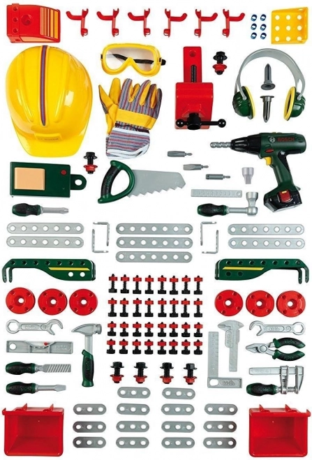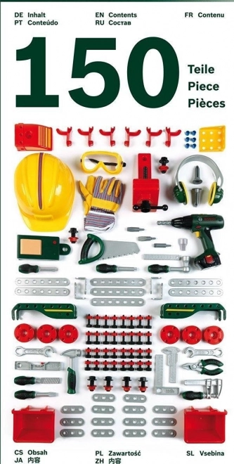 Popolna otroška delovna miza BOSCH s 150 deli prinaša realistično orodje in dodatke za male mojstre. Vključuje akumulatorski vijačnik, žago, kladivo, ključe, klešče, vijake in matice ter stabilno stojalo z perforirano steno za pregledno shranjevanje. Kakovostna plastika zagotavlja vzdržljivost, igra pa spodbuja kreativnost in fino motoriko za dolge ure zabave.