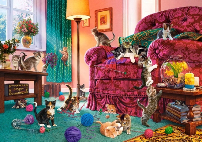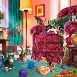 Sestavljanka prikazuje prijeten dnevni prostor, poln nagajivih muckov in barvitih klobčičev volne.
