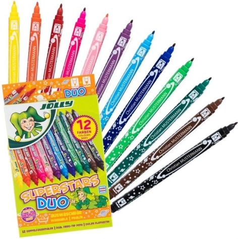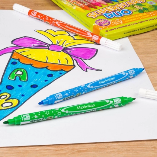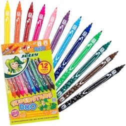Odkrijte ustvarjalnost z dvostranskimi flomastri Superstars Duo v kompletu 12 živih odtenkov. Vsak flomaster ima dve konici za natančne linije in polno barvanje, idealno za otroke od 3 let dalje in odrasle. Zaradi kompaktne dolžine 17 cm se udobno držijo in zlahka pospravijo v peresnico. Certifikat CE zagotavlja varno uporabo. Odlično za šolo, pisarno in ustvarjanje doma.