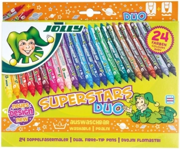 Razvijte otroško ustvarjalnost z obojestranskimi flomastri SUPERSTARS DUO. Praktična izvedba 2 v 1 prihrani prostor v peresnici in ponuja natančnost ter popolno prekrivanje v enem flomastru. Komplet 24 barv je odličen za šolske projekte, pobarvanke in ustvarjanje doma.