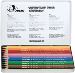 Odkrijte kakovostne trikotne barvice DELTA z 12 živahnimi odtenki. Mehka mina gladko drsi po papirju, barve se dobro plastijo in senčijo, zaradi odpornosti proti lomljenju pa zdržijo dlje. Kovinska škatlica barvice varno hrani in jih ohranja pregledno urejene.