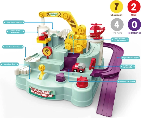 Ta ovirna proga spremeni vsako vožnjo v malo avanturo. Na progi čaka vrsta ovir, ki jih otroci premagujejo s pametnim upravljanjem s kolesci in ročicami. Vsak uspeh motivira k novim poskusom ter prinaša veliko veselja in zdrave tekmovalnosti.