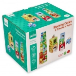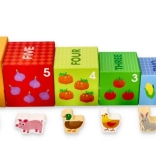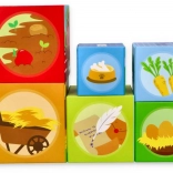Ta barvit set stapelnih kock z motivi kmetije otrokom ponuja neskončne možnosti igre: od gradnje visokega stolpa do vstavljanja in razvrščanja ter odkrivanja števil, plodov in prisrčnih živali. Vsaka kocka je ilustrirana tako, da podpira vizualno zaznavanje, prepoznavanje oblik in količin ter prvo štetje.