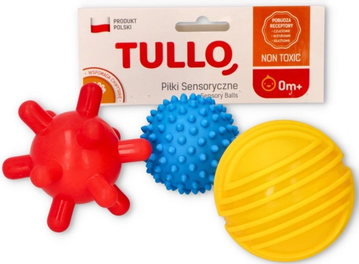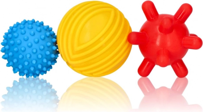 Komplet vsebuje tri žogice, izdelane iz varne in trpežne plastike. Žogice pomagajo razvijati motorične spretnosti otroka ter zagotavljajo, da je igra hkrati zabavna in poučna.