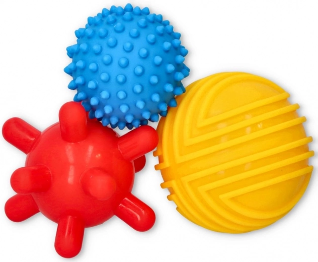 Senzorične žogice za otroke s teksturiranimi površinami za stimulacijo in razvoj čutov. Varne in trpežne, idealne za otroke od rojstva dalje.