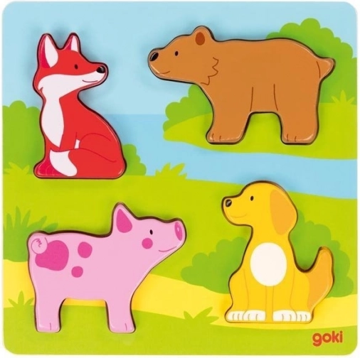 Odkrijte zabavno in izobraževalno leseno vstavljanko GOKI, ki združuje tipne zaznave, oblike in barve. Otroci si urijo fino motoriko, logično razmišljanje in prepoznavanje živalic zahvaljujoč tipnim vzorcem »dlake in kože« pod posameznimi koščki. Vstavljanka je idealna za prvo učenje skozi igro že od 1. leta naprej.